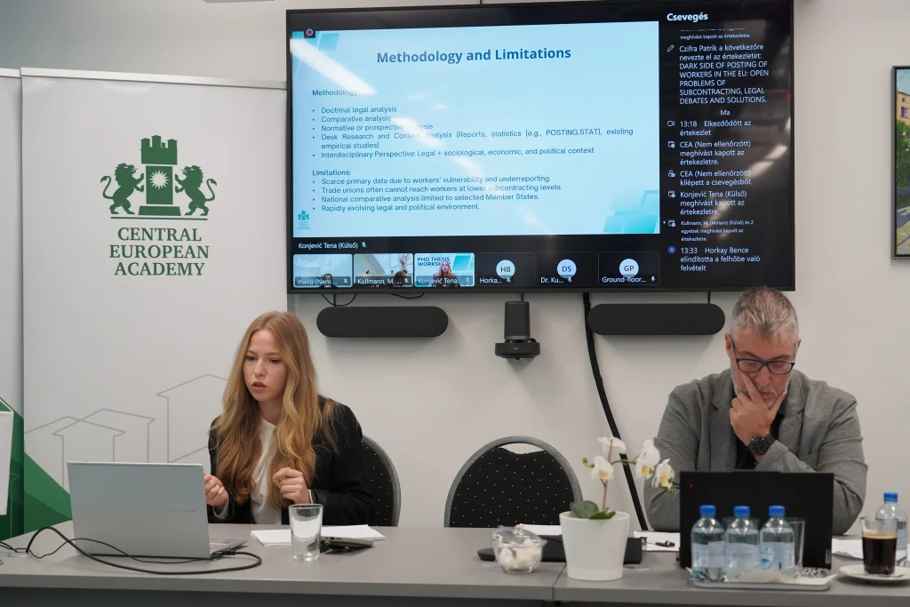 On October 20–21, 2025, the “Thesis Workshop” organized by the Central European Academy was held. The aim of the event was to provide fourth-year doctoral students with practical experience in defending their dissertations. The workshop closely simulated the official defense process, allowing candidates to present their main findings and arguments, respond to criticism, and answer questions from experts. Each presentation was followed by a discussion with designated opponents, who provided constructive feedback and challenged the candidates’ work, thereby creating an opportunity to strengthen both content and presentation style.